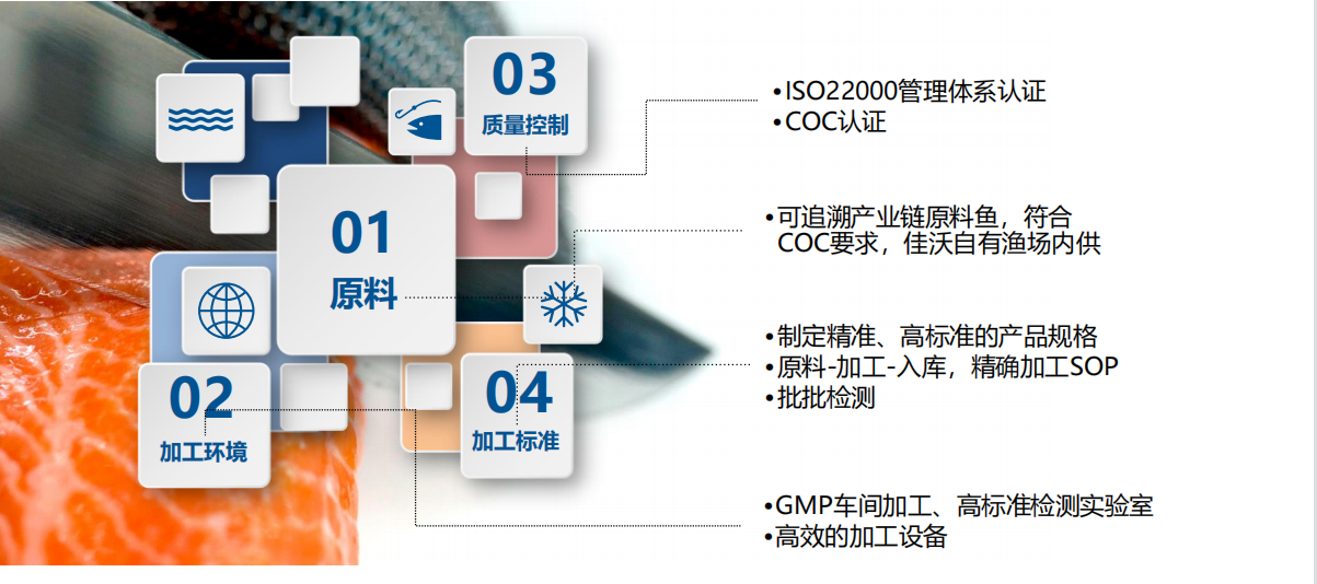 同時(shí),馬小剛還分享了佳沃食品在三文魚智慧化養(yǎng)殖及生產(chǎn)上的品控經(jīng)驗(yàn)。佳沃食品三文魚來自被譽(yù)為全球最佳海水養(yǎng)殖區(qū)的智利南端純凈海域自有漁場,擁有無可比擬的生長環(huán)境優(yōu)勢,從采購受精卵,到淡水育苗,再到海水養(yǎng)殖,佳沃三文魚的整個(gè)生長過程都有先進(jìn)的數(shù)字技術(shù)追蹤和管理,每一條魚都符合最嚴(yán)苛的高品質(zhì)篩選標(biāo)準(zhǔn),佳沃三文魚也因此獲得了全球最佳水產(chǎn)養(yǎng)殖規(guī)范的最高級別—BAP四星認(rèn)證。