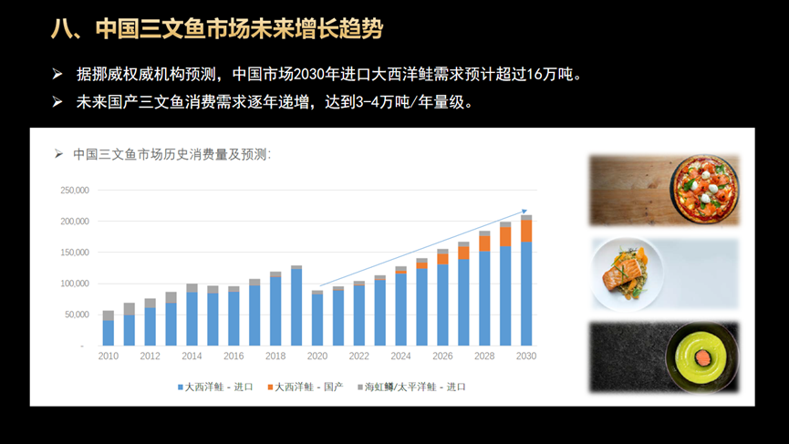 演講中,梁欽垚與與會(huì)行業(yè)伙伴分享了來(lái)自國(guó)際權(quán)威行業(yè)研究前沿的專業(yè)數(shù)據(jù)。他提到,疫情后時(shí)代,中國(guó)市場(chǎng)家庭烹飪場(chǎng)景中的三文魚(yú)消費(fèi)占比增長(zhǎng)明顯;三文魚(yú)作為一種高營(yíng)養(yǎng)健康食材,正逐漸深入普通家庭的日常消費(fèi)。隨著中國(guó)三文魚(yú)價(jià)格的理性回歸,未來(lái)三文魚(yú)消費(fèi)需求將逐年遞增,無(wú)論國(guó)產(chǎn)三文魚(yú)還是進(jìn)口三文魚(yú),都將迎來(lái)新的發(fā)展機(jī)遇。